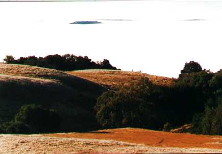 Lafferty Ranch often rides above the fog that blankets the valleys. Mt. Burdell, near Novato, is visible to the south as another island in the sea of fog.