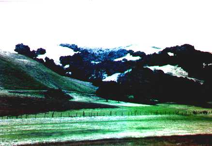 Lafferty Ranch dusted with snow. Photograph taken by Scott Hess from Sonoma Mountain Road on February 26, 1996.